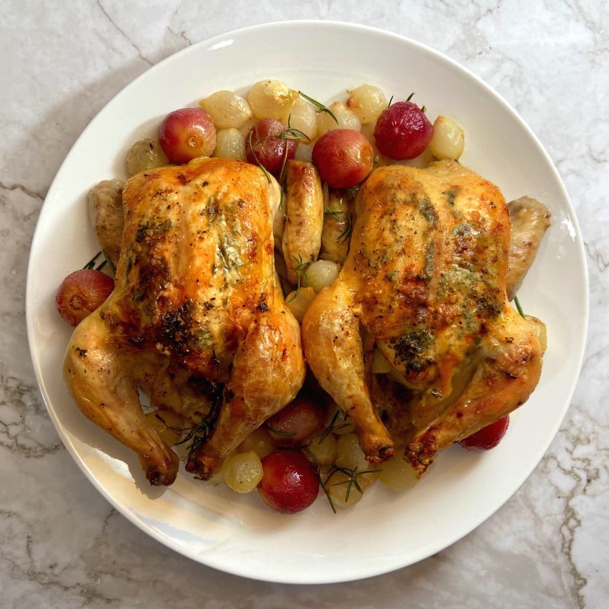 Hens Roasted with Cipollini Onions and Balsamic Grapes