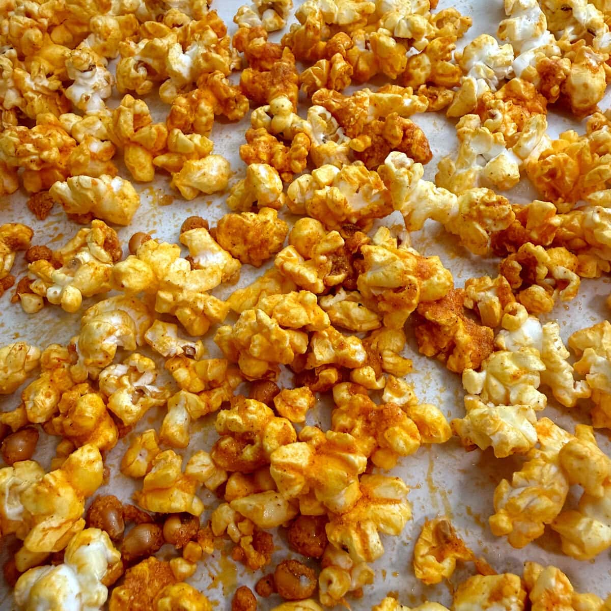 Now onto your much easier and less time consuming cheddar popcorn. Melt the butter in a saucepan and whisk in cheese powder and mustard. Immediatley pour over popcorn (also on a parchment lined baking sheet) and toss to coat evenly. No additional salt needed-- the salt would just turn into bodies.. into mummies........