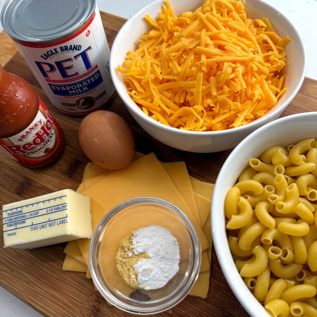 Boil macaroni in salted water until al dente, 8-10 mins. While you wait, whisk together the evaporated milk, egg, and hot sauce in a bowl until homogeneous. Toss the cheeses with the cornstarch and dried mustard in a large bowl until thoroughly combined. When pasta is done, drain into a colander and return it to the saucepan.
