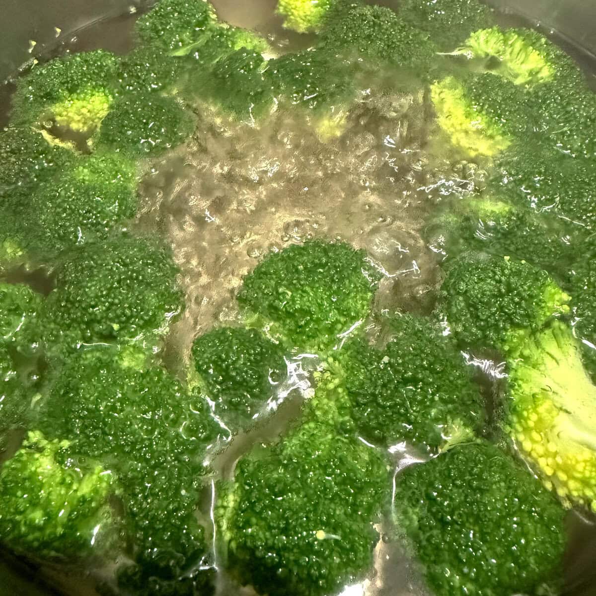 Start by blanching your broccoli in a saucepan of salted water-- this should take no more than 2 minutes if you're looking to retain a little crunch. Drain and place on paper towels to dry.