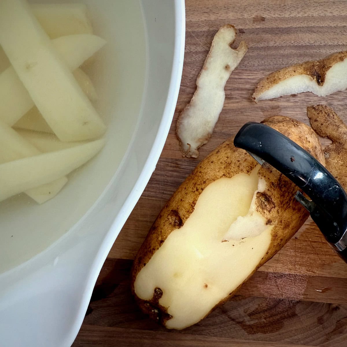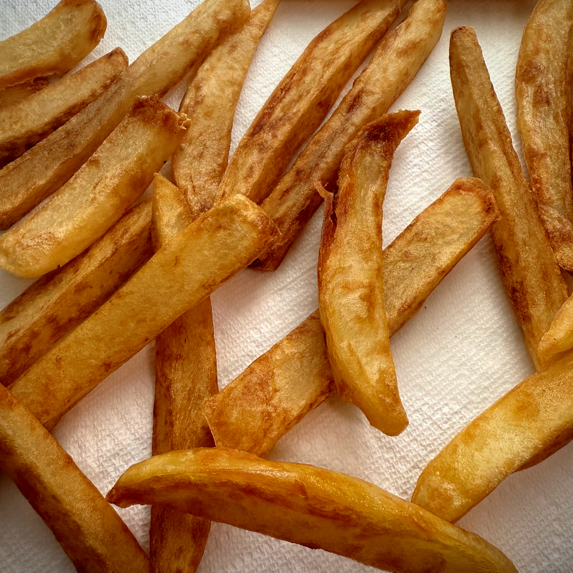 While you wait, heat oil in the same pot to roughly 380 degrees (I use a candy thermometer to make sure I've got the right temp). When you're ready to fry separate your potatoes into four batches and fry each for 1 minute. Temperature will fluctuate as you add and remove batches, so play with your gauge and wait between batches to make sure you stay at around 380. A word of advice-- do NOT try for less than four batches. Your oil could boil over and cause a grease fire and those are never, I repeat NEVER, fun.