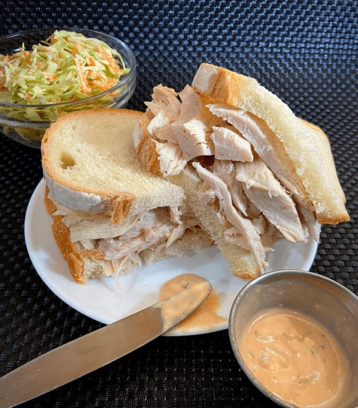 Pastrami or turkey breast, lettuce, tomatoes, and Russian dressing.